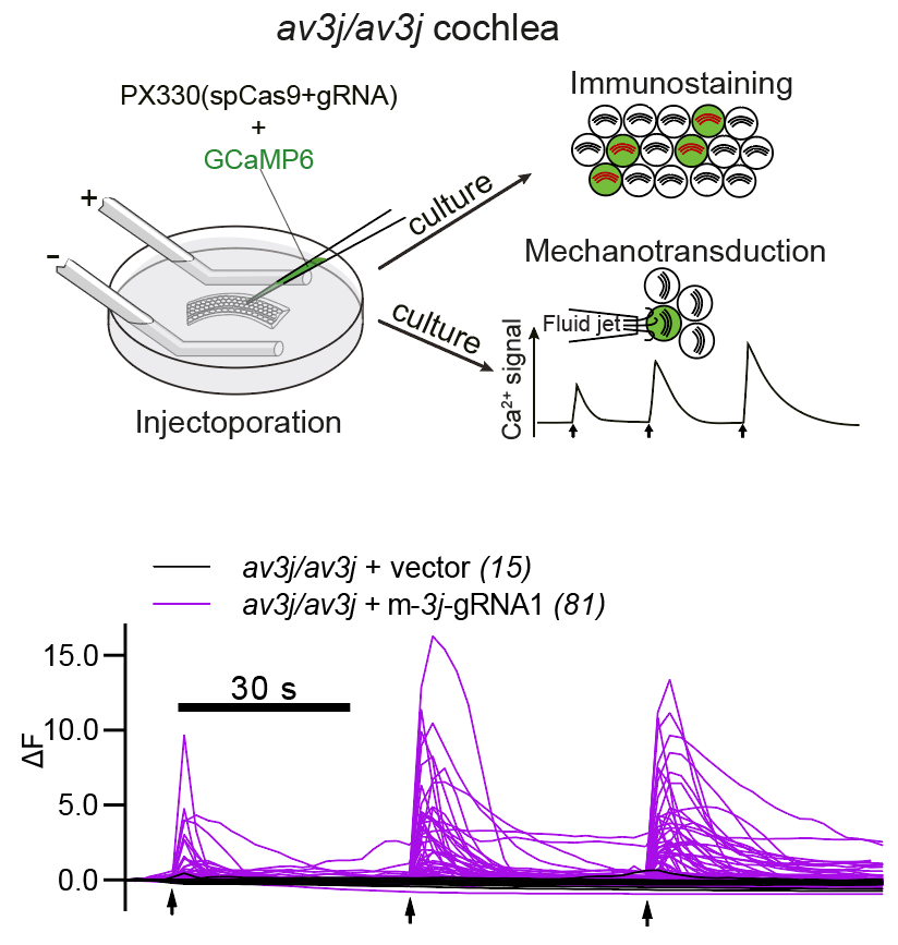2014年,熊巍团队就开发了一套耳蜗组织培养和基因电转递送的系统解决方案,在此基础上,他们首先扫描了av-3j突变(1bp插入)上下游15bp的区域内的4条gRNA所产生的编辑产物,发现其中的m-3j-gRNA1表现出高比例的1bp删除的编辑产物,而且重复性很高,这意味着m-3j-gRNA1是一个潜在的治疗av-3j突变的备选gRNA。在培养的Pcdh15av-3j耳蜗组织上,他们又通过电转表达了spCas9和m-3j-gRNA1的Pcdh15av-3j毛细胞可以恢复PCDH15蛋白的表达,同时Pcdh15av-3j毛细胞的机械转导功能也有所恢复。