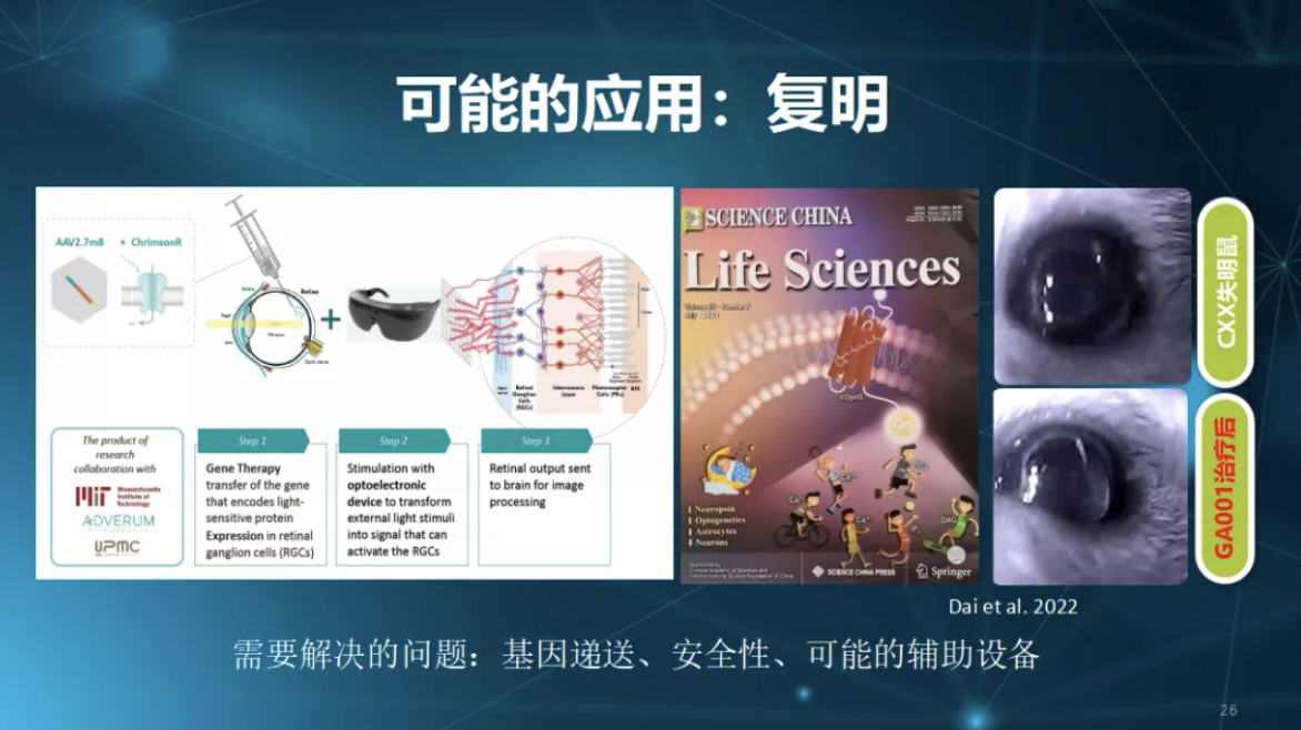 这有什么用?大家可能会想,你不会给我脑子里插根光纤吧?有可能。一个比较现实的事情就是用来做复明,比如把一个盲小鼠表达上有一个光明探针,这个小鼠就可以感光了。我们现在在医院做这个临床试验,一些盲人就可能通过这个技术重新感光。