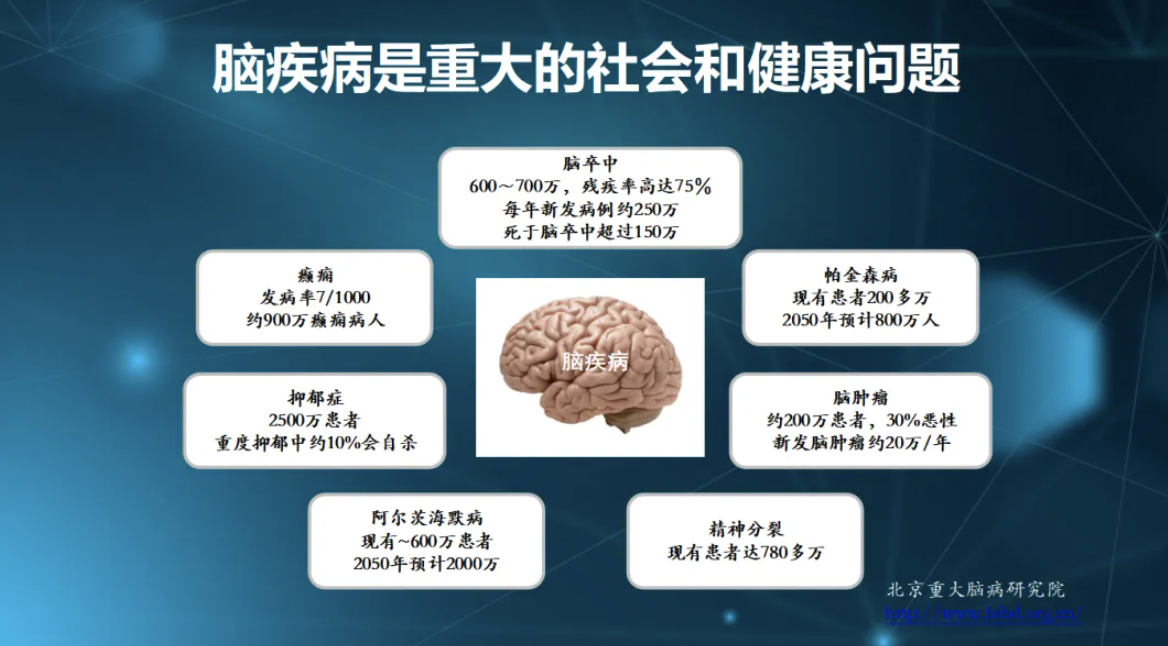 人脑很强大、很节能,也很容易出问题。事实上,人脑出的问题导致的精神疾病、脑疾病所占社会成本占所有疾病的25%以上,包括脑卒中、癫痫、帕金森、抑郁症、脑肿瘤、老年痴呆和精神分裂等等。
