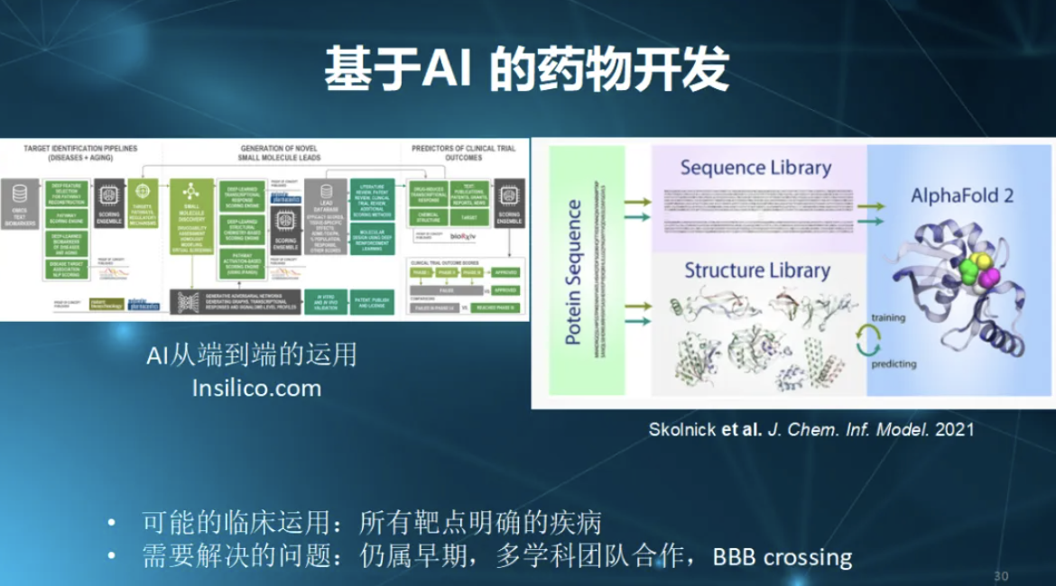 现在AI在各领域得到了广泛的应用,AlphaFold让我们知道几亿个蛋白的结构,基于AI的药物开发也逐渐进入脑神经科学领域里,我们也期待AI可以推动药物的设计和药物的研发。可能在所有的靶点明确的疾病里都可以得到应用,需要解决的问题当然很多,还可以做很多学科的合作。