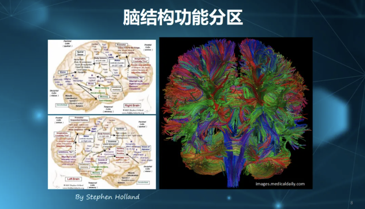 如果有些病人不小心脑出血,特定的脑区出问题了,知道某个脑区哪些功能受损,了解到不同的脑区参与不同的功能。大体上,可以把人脑分为将近600个区域,大部分脑区的功能或多或少都有所了解。当然,有些脑区的功能可能比较复杂,我们给它取名“联合区”。如果把一个脑区作为一个计算工作站,脑区和脑区之间还有很多“网线”连起来,就是所谓的神经纤维连接。可以看到,上图右边是全脑的、不同脑之间的神经纤维的连接。