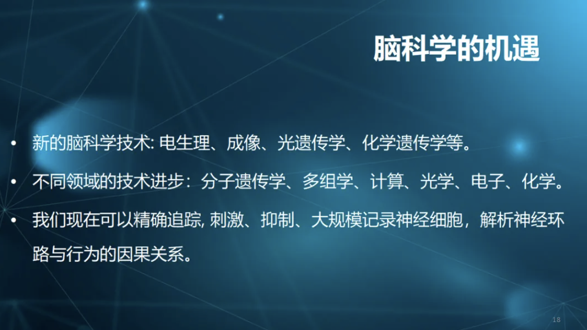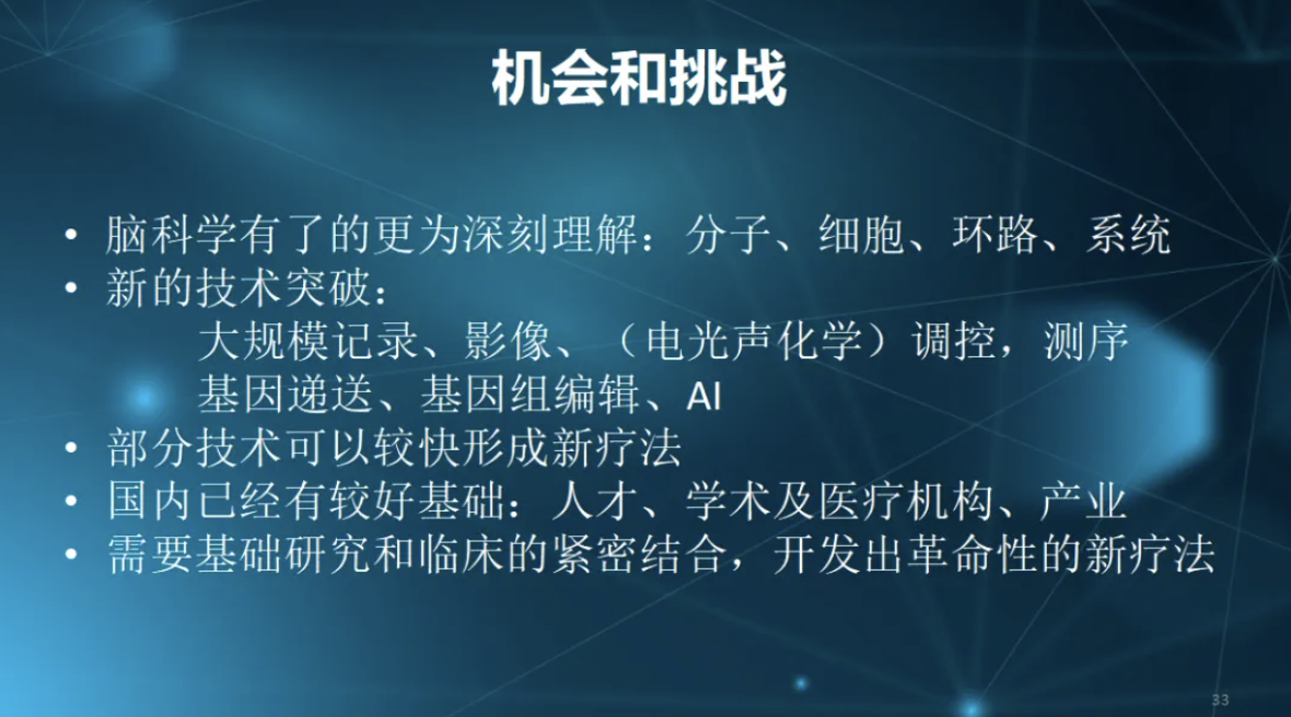 现在,脑科学已经有了比较深刻的、更好的理解,在分子水平、细胞水平、环路水平和系统水平,也有一些新的技术突破,我们有大规模记录、影像、调控、测序、基因递送、基因组编辑、AI等技术手段。部分技术可能允许我们很快形成新疗法,我们认为,国内已经有比较好的基础,有很好的人才、学术以及医疗机构,比如天坛、宣武都有世界最顶尖的大规模医院,也有新的产业,需要基础研究和临床紧密结合,需要多个领域紧密结合,从而开发出革命性的新疗法。