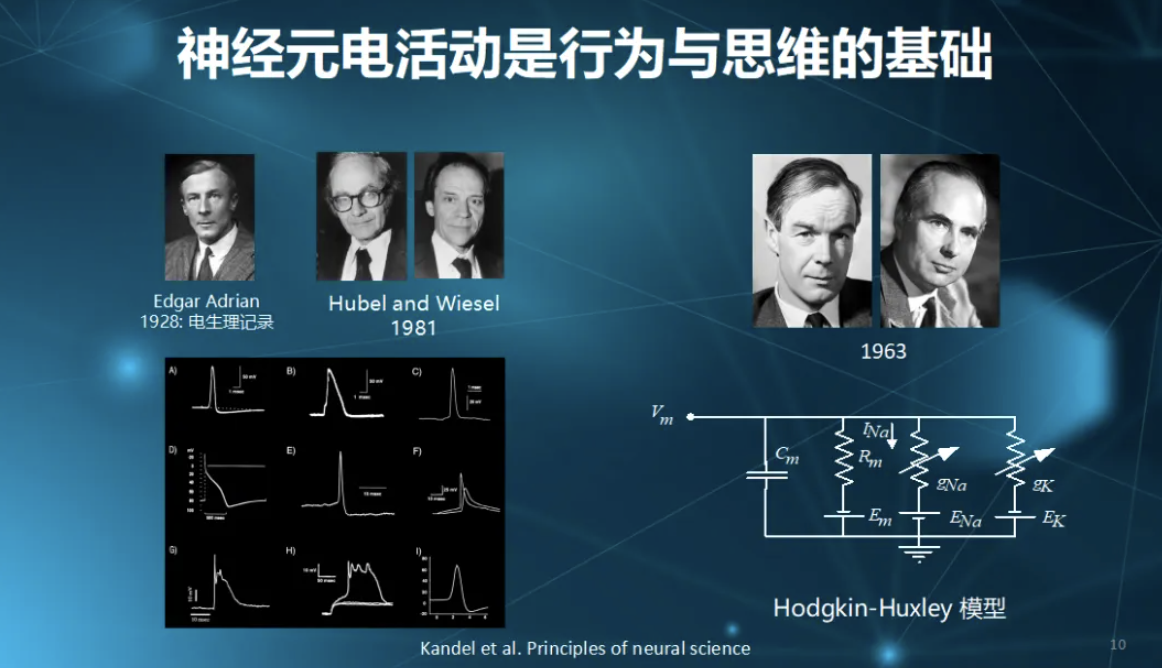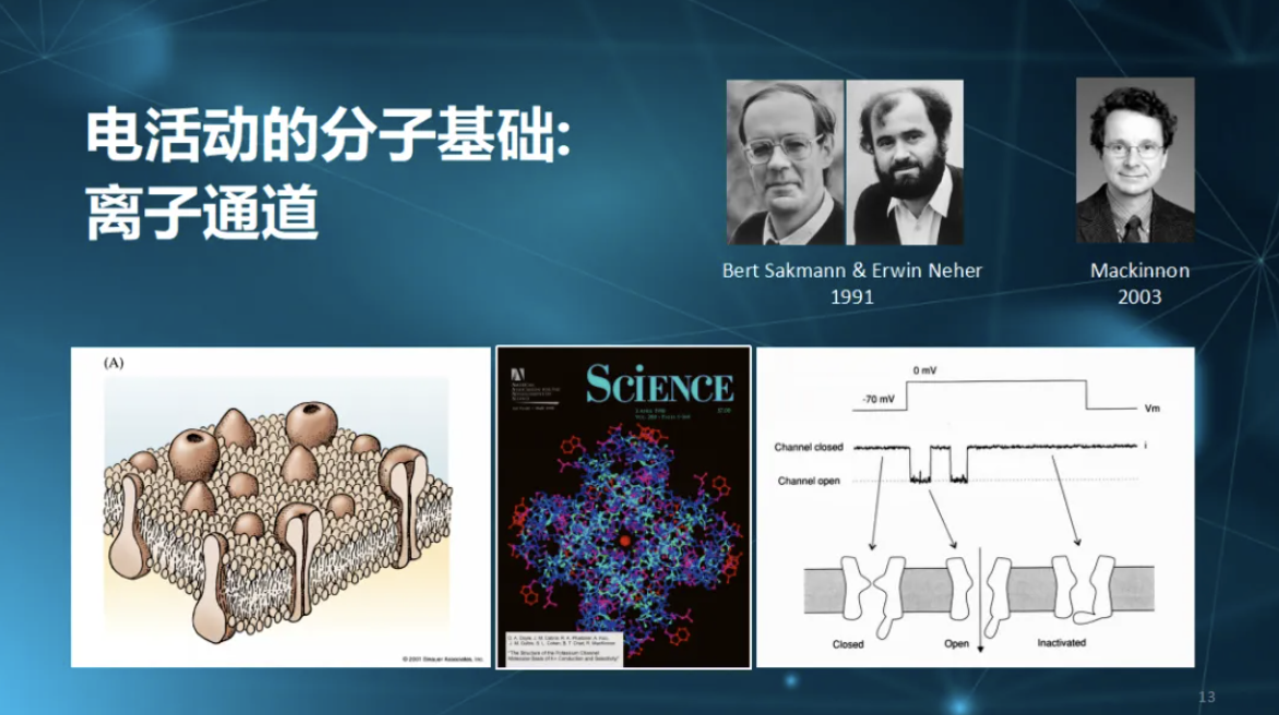 我们除了理解到神经细胞的电活动很重要,也对它电活动的分子基础有了很好的理解。我们都知道,神经细胞膜上有很多离子通道,所谓特殊蛋白,它们的开放导致细胞导电性的变化,从而导致动作电位的变化。细胞和细胞之间的传递主要是化学传递,一个细胞激活之后通过释放一个神经递质影响下一级的神经细胞。