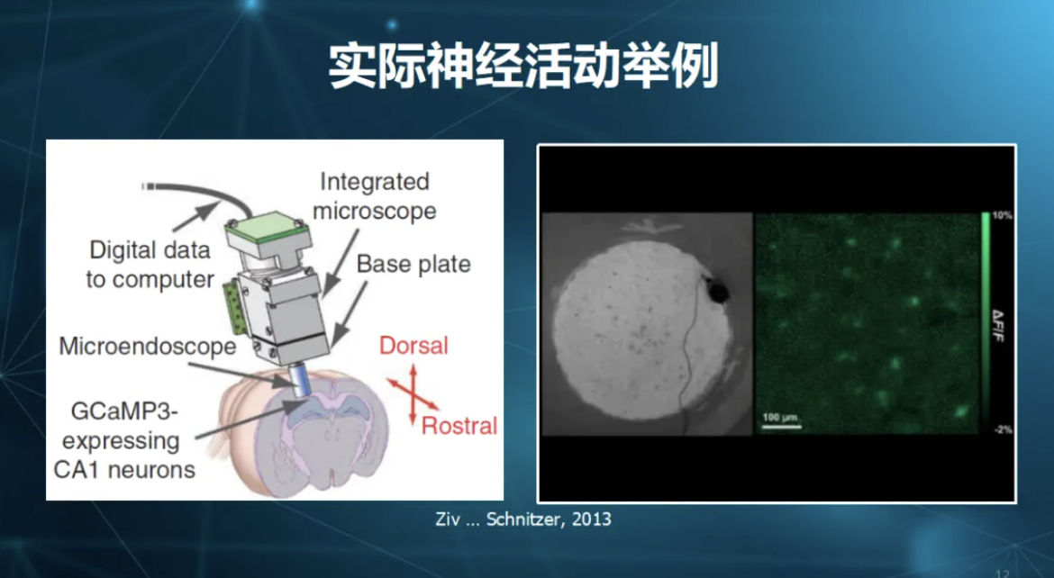 过去二十年间,神经科学取得的一些最重大的进展主要是在技术上的进展。可以通过大规模的光学成像来看不同特定类型的神经细胞,在运动或清醒过程当中发生什么变化?比如,可以戴微型显微镜观察小鼠的海马,小鼠刚才在走动时一闪一闪的,就是每个神经细胞兴奋的过程。