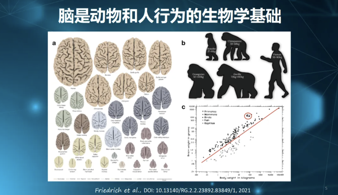 人的计算功能和人的脑疾病归根到底都是与脑有关,神经科学院是研究脑子的,脑是动物和人行为的生物学基础。上图所示(左图),不同动物脑子的形状,比如小鼠的脑子0.4g,人的脑子1400g左右。大家都说人聪明是因为人脑子大,我可以告诉大家,也不完全是。比如,大象的脑子可能是4kg左右,鲸鱼的脑子可能是9kg左右,是人脑的很多倍。从质量上来说,可能人不是最聪明的动物。