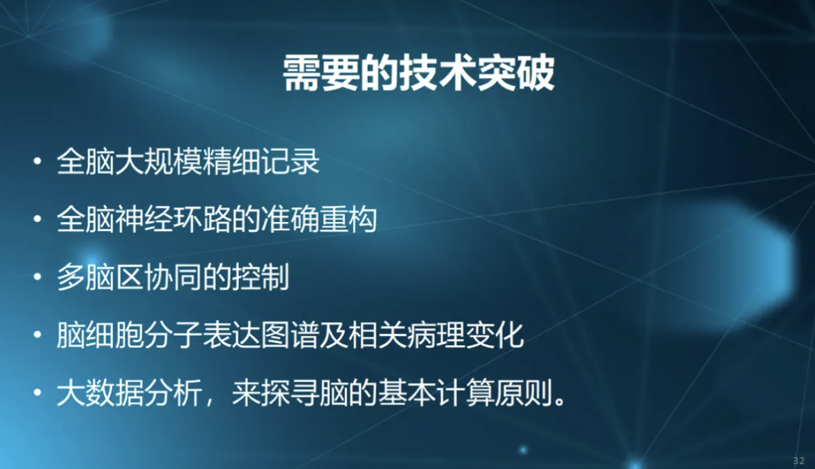 过去一百年间,我们已经理解了脑神经系统大体的概念。过去二十年间,我们也有很多新的技术。未来如果有更大的科学突破,我们需要有更多的技术突破,包括全脑大规模的精细记录,全脑神经环路的准确重构,多脑区协同的控制,脑分子表达图谱及相关病理变化做出理解,包括用大数据分析,来探寻脑的基本计算原则。
