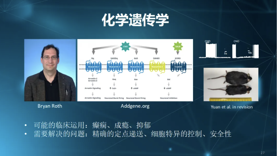 除了光的控制还有化学、遗传学的控制,我们可以在特定脑区里表达一个探针,可以用药来调节神经细胞的电活动。比如,我们用这个手段可以让一个小鼠狂吃,变得非常肥胖,也可以让这个小鼠不吃,变得非常消瘦。如果用这个手段,所谓的分子学基因治疗手段,可以非常精确地调节神经细胞电活动,来达到对行为的控制。
