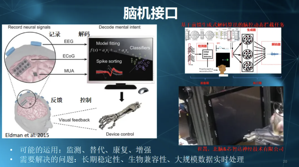有了大规模电生理的记录,现在可以记录人在清醒、运动、思维过程中某些特定脑区的电活动,来解码这个电活动所对应的感知或运动,并实现控制,这样就可以达到所谓的脑机接口。