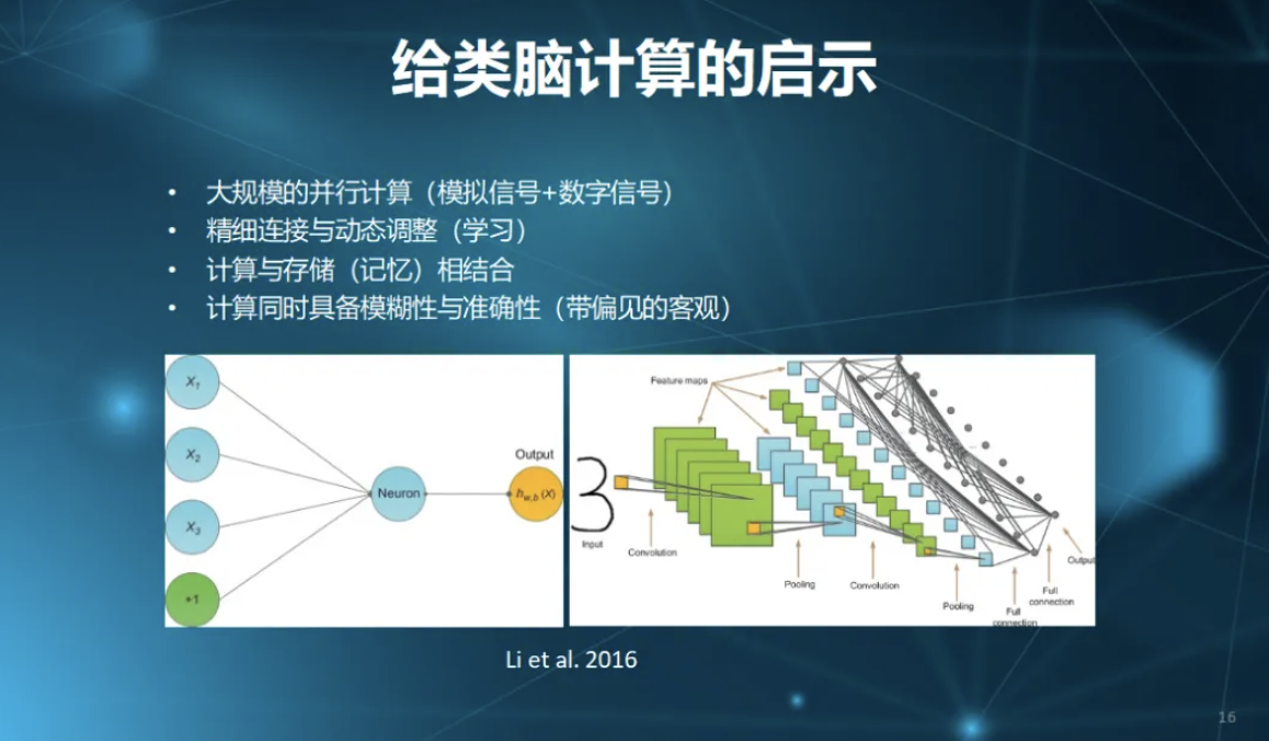 过去几十年间,我们对神经细胞之间连接的理解,事实上对现有的类脑计算带来很多启示。他们都是大规模的并行计算,刚才讲到Hybrid系统,都是模拟信号,比如神经递质的释放和数字信号,比如动作电位和脉冲混合的计算,它是精细连接和动态调整,可以形成学习;另外是存算一体,计算和存储相结合的;最后一点是我们的计算兼具模糊性和准确性。