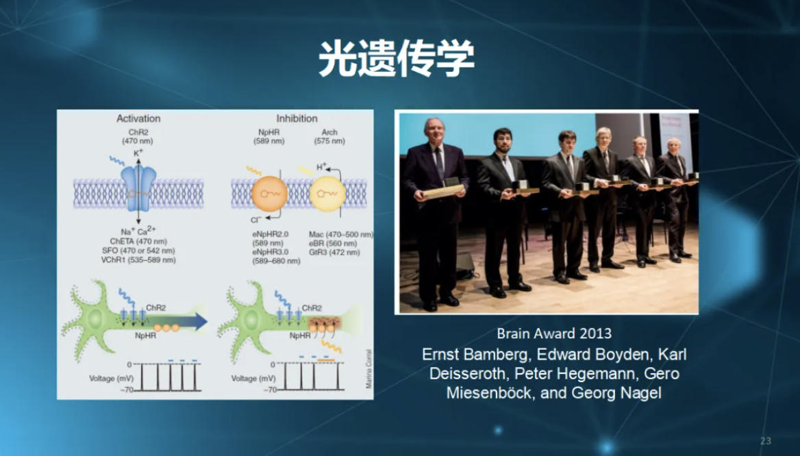 最近二十年间的一个技术发展是光遗传学,我们的神经细胞一般来说不会被光激活,但是大自然界里很多东西可以被光激活,可以把对光敏感的探针表达到神经细胞里,这样神经细胞的电活动就可以用光来调控,形成所谓的光遗传学。