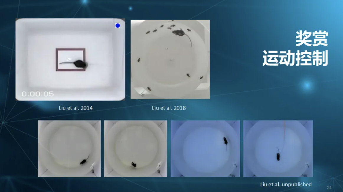 可以通过光纤的手段记录特定脑区对运动的控制信号,同时转化为一个命令式的信号,来激活另外一个脑区,形成脑脑接口。这样,一个小鼠可以控制另外一个小鼠,像阿凡达似的,可以在一个房间里记录一个小鼠的信号,同时把这个信号注入到另外一个小鼠里面去,可以看到两个小鼠运动实现了高度的同步。