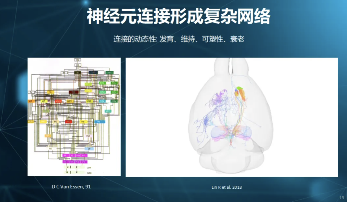 静态的连接虽然是现在脑科学的一个研究热点,但仅仅是研究里所需要解决的很小一部分。人脑的连接、神经系统的连接就像今天听到的很多人工智能的人工神经网络系统一样,细胞和细胞之间的连接是动态的,这个动态可以随着发育发生变化,可以随着衰老发生变化。另外是随着经验,也就是人工神经网络里经常说到的一句话,细胞和细胞之间的连接可以随着经验而产生连接的权重调整,这种权重的调整就形成了我们的记忆和学习过程。