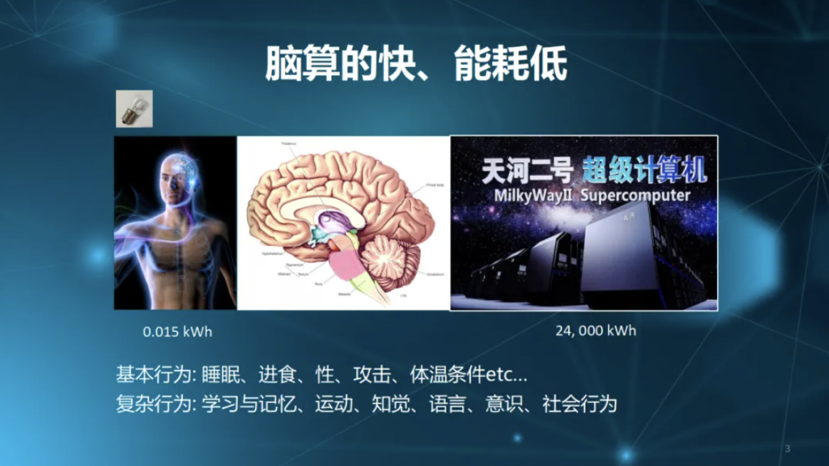 人的脑子不仅功能很强大,另外一个特点是能耗特别低,好几位科技主讲人都曾提到新的高性能计算设施,能耗是一个很大的问题。比如,“天河二号”用了2.4万W度电/h,人脑只有15W,相当于一个冰箱、电灯泡的耗能。所以大家肯定很好奇,人脑是怎么做到用这么低的能耗做这么复杂的计算。