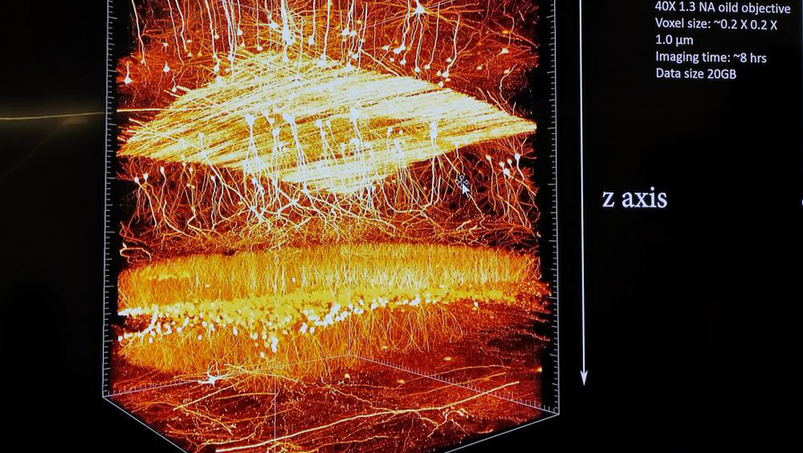 为了更完整直观地去研究脑神经,赵瑚做了一个标本。在一块长方体琥珀下,躺着一只全身透明的小白鼠。这只透明标本完整地保留了小白鼠的皮肤、肌肉、骨骼、神经……这就是他研发的“新型透明化包埋技术”。该方法实现了对动物从小组织到全器官、从表浅到深部、甚至透过硬组织到软组织的同时透明化包埋。结合他们设计的样本加工装置和共聚焦显微镜,可以对任意大小样本直接进行高分辨三维显微成像,让深部组织的神经、血管、标记蛋白等完整呈现。
