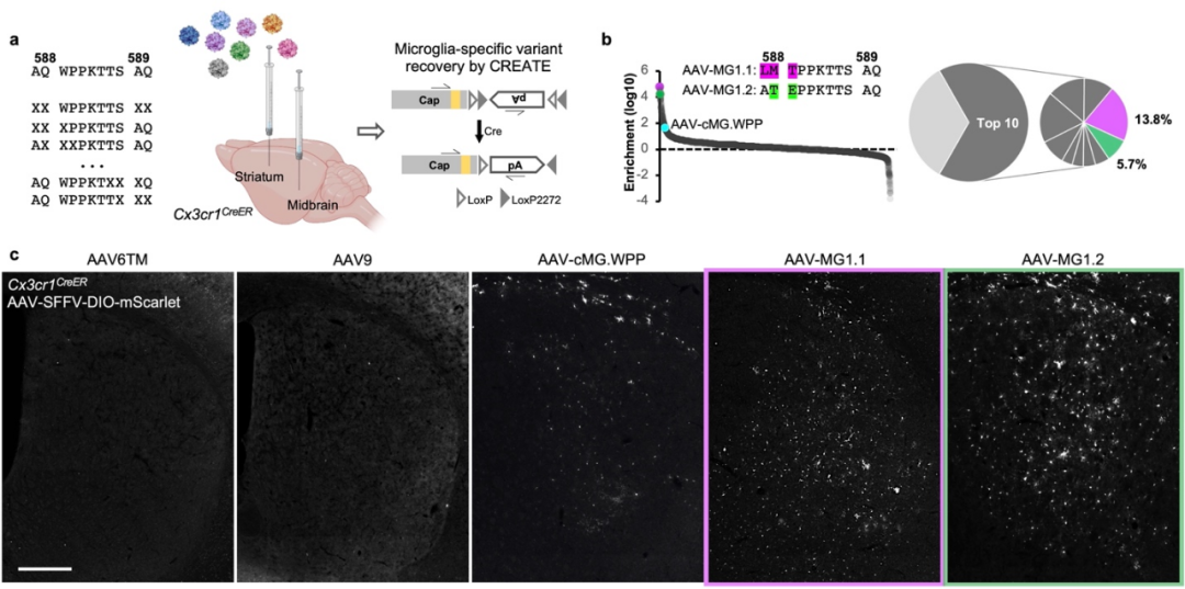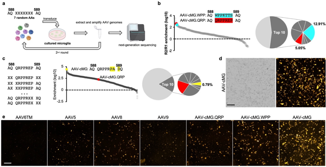 在最新这篇论文中,研究人员针对野生血清型AAV9的衣壳蛋白进行改造。AAV由衣壳蛋白和单链DNA基因组所构成,其侵染特性由衣壳蛋白所决定。研究人员将7个随机氨基酸组成的短肽插入至AAV衣壳蛋白的特定位置中,并利用这些突变衣壳蛋白包装制备AAV突变病毒文库。文库中不同的rAAV病毒颗粒表面展示有不同序列的短肽。研究人员首先在体外培养的小鼠小胶质细胞中对该文库进行两轮筛选,鉴定出两个衣壳蛋白(AAV-cMG.WPP和AAV-cMG.QRP)能够在一定程度上提高rAAV病毒对体外培养的小鼠小胶质细胞的侵染效率。以此为基础,研究人员针对AAV-cMG.QRP的插入肽段及其在衣壳蛋白插入位点的相邻氨基酸进行突变筛选,成功得到了高效侵染体外培养小胶质细胞的AAV-cMG衣壳蛋白。通过RNA测序,研究人员确认AAV-cMG侵染体外培养小胶质细胞并不导致小胶质细胞的激活。