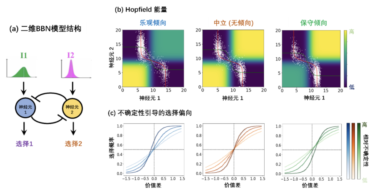 BBN模型的核心是一组随机微分方程,描述了神经元之间的相互作用和带有随机不确定性输入的影响。理论分析表明,这个模型能够实现贝叶斯后验采样,即根据输入信息推测最可能的网络状态。更重要的是,BBN模型能够通过不同的参数,灵活地调整探索策略——有时乐观(偏向探索),有时保守(偏向利用),有时中立(没有偏向)。
