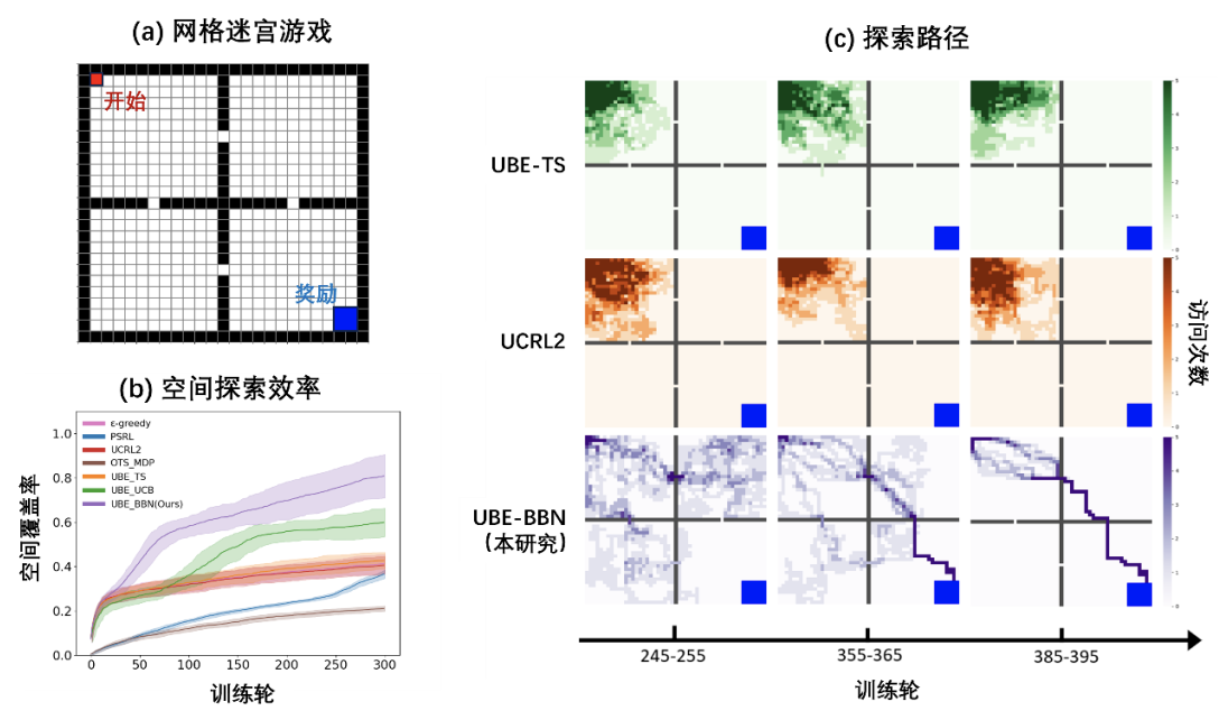 在经典的多臂老虎机和马尔可夫决策过程(MDP)任务中,BBN模型展现出了强大的探索能力。尤其是在奖励稀疏的环境中,BBN能够快速覆盖整个环境,找到奖励所在区域。与其他算法相比,BBN在探索效率和覆盖率上具有显著优势。