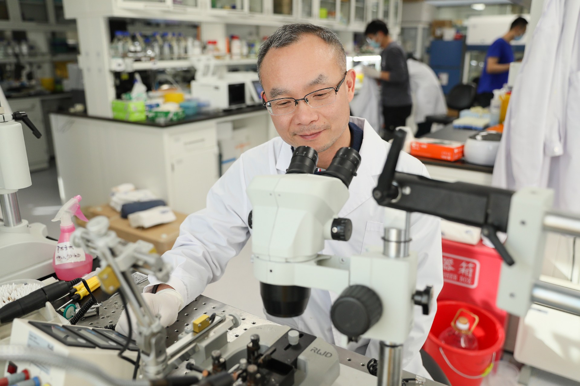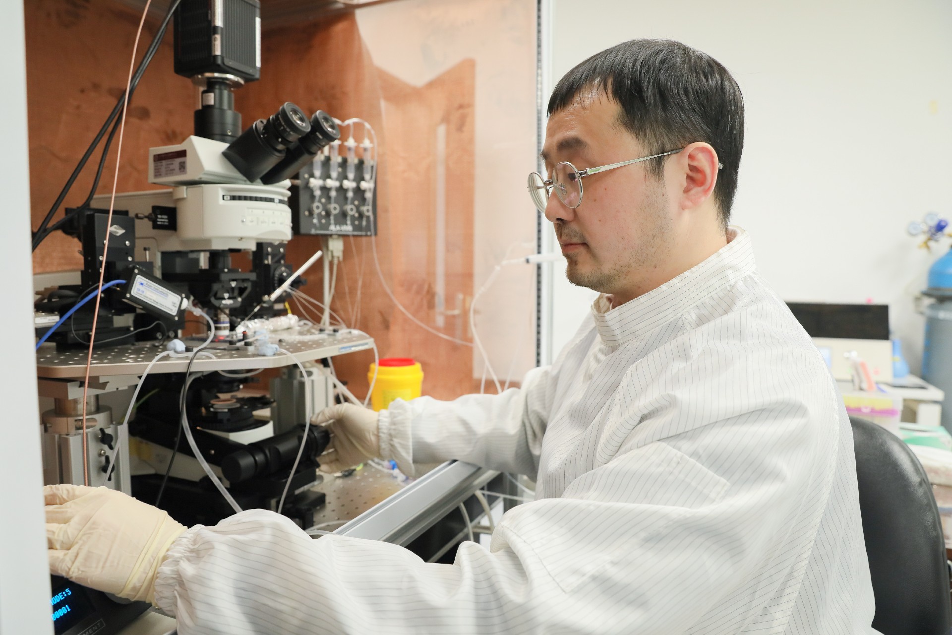 脑中心PI王同飞在做脑片电生理实验
