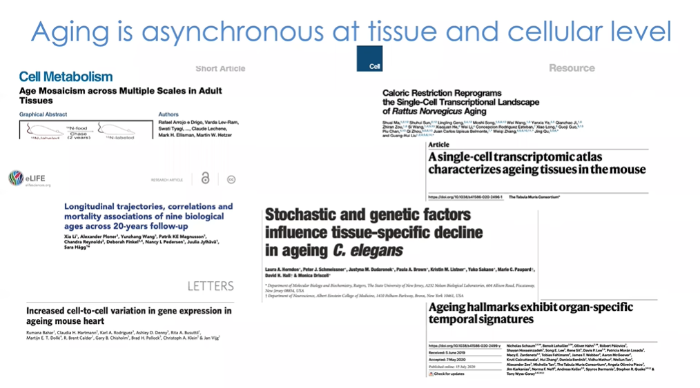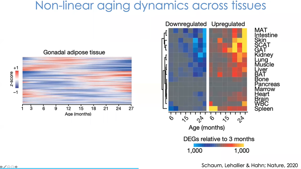 我们可以观察到率先出现年龄相关变化的组织(图16)。一些细胞和特定转录物较早发生变化,而其中最早出现的应该是胸腺,紧接着是脾脏、脂肪组织和其他组织。这些结果是实实在在基于数据得出的,通过数据我们可以明确哪一个组织发生了老化,并采取针对性干预手段。