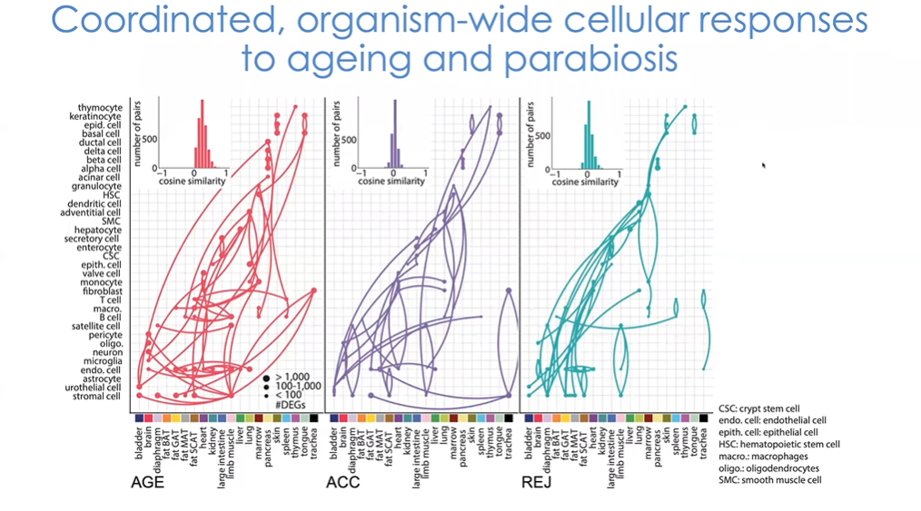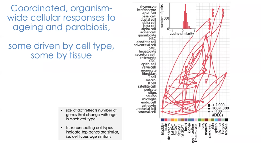 一个更有趣的视角是从整个生物体的角度来看,在共生模型中,整个生物体对衰老过程是否存在整体的细胞反应?图21中的图表由Robi制作,反映了正常的衰老过程。图中主要展示了我们目前已经研究过的细胞,反映出了很多有趣的信息。研究中我们分析不同细胞类型及其来源组织,图中点的大小反映了每种细胞类型中有多少基因随着年龄而变化。点之间的连线显示了随年龄变化的基因之间的相似性。小图中展示了随着细胞的衰老,基因表达的总体相似性。一些细胞显示出许多随年龄变化的相同基因。我们可以假设,如果两个不同细胞类型具有相同的基因随年龄改变,那么他们可能会对外部刺激做出反应,从而诱发这些与年龄相关的变化。这些变化之间密切相关,由遗传程序决定。对此我们还没有最终结论,但能够在如内皮细胞等细胞中观察到这种现象也十分有趣。