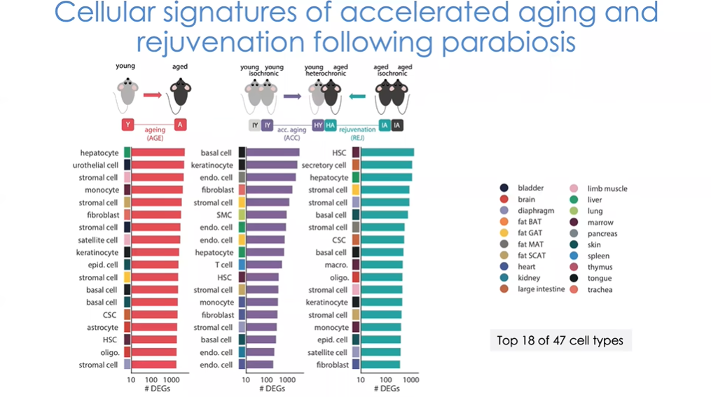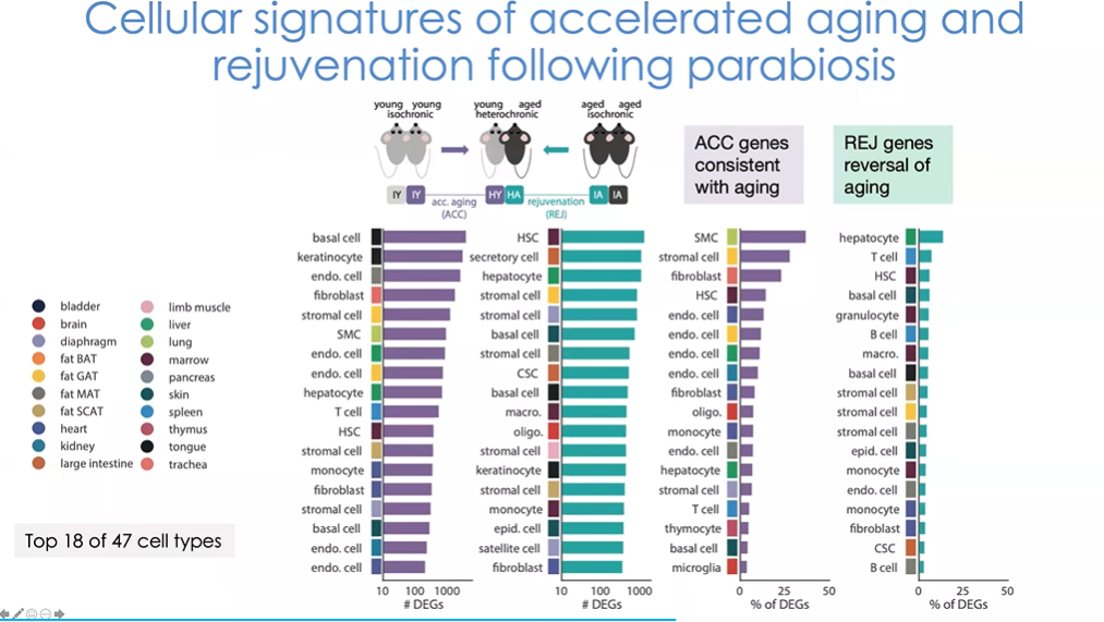 接下来我们看在逆转衰老模型中,哪些随年龄变化的基因发生了逆转(图19)。居首位的是造血干细胞,这一结果对免疫学者们而言尤为激动人心。实验中我们将老年小鼠暴露于年轻小鼠的血液环境中,结果表明小鼠体内干细胞对其所处环境高度敏感。同时我们也注意到肝细胞以及一些干细胞如基质细胞等,也表现出较强的反应。