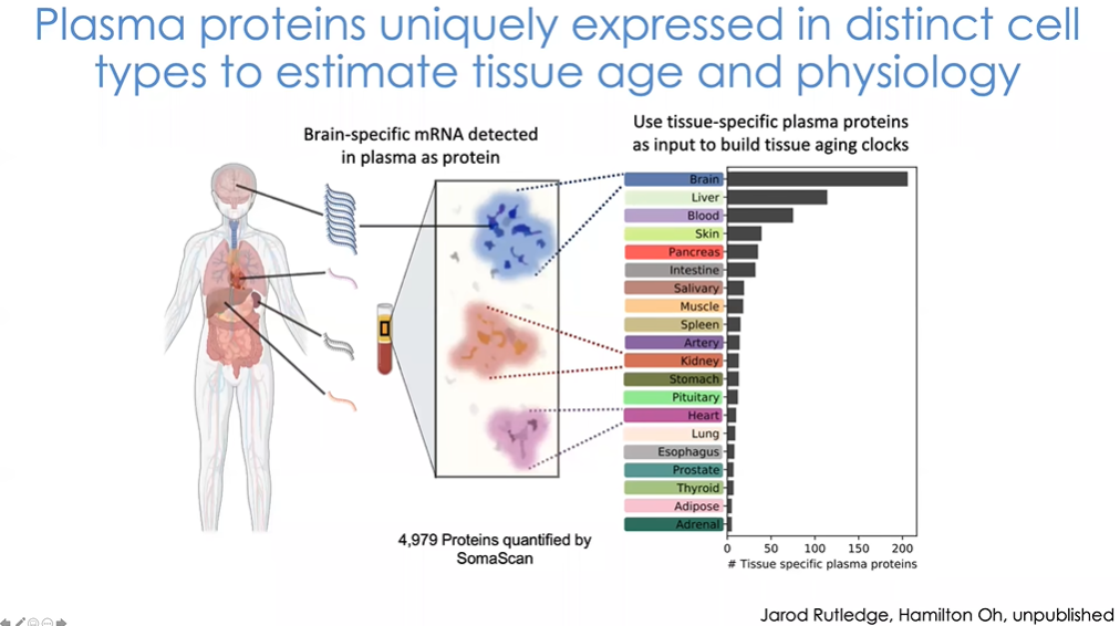 最后,我想向大家展示利用这些信息我们还可以做些什么。这些蛋白质中包含了有关生物体生理状态的信息。由Hamilton Oh和Jarod Rutledge牵头的一系列研究目的在于探究我们是否能够通过观察血液中的蛋白成分来理解大脑衰老或大脑的生理状态(图29)。研究可行性在于,生物体血液中的一些蛋白质来源于大脑,因此如果我们能够识别这些蛋白质,我们就能在一定程度上解读大脑功能。当然,目前医院也能对血液中的特定蛋白进行检验,以确定胰岛素水平、滤过率等指标。但我们追求的是通过对数以千计的蛋白质进行大规模蛋白质组学分析,以将检测结果提高到一个全新的水平。通过观察具有组织特异性的特定蛋白质,我们可以推测其来源,同时观察它们是否能够反映其组织功能(图30)。