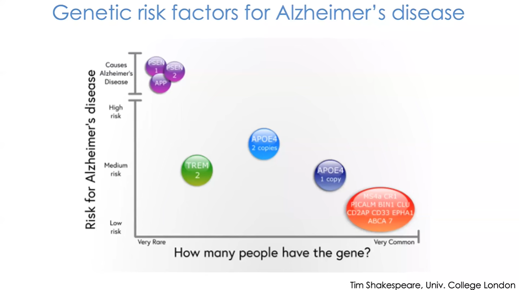 图1展示的是一个阿尔茨海默病遗传学示例,也同样适用于其他疾病类型。目前,我们掌握了一些会影响个体对某些疾病(如阿尔茨海默病等)易感性的遗传信息。已知导致显性遗传性阿尔茨海默病的突变非常罕见,具有该突变的人群可能在20、30、40岁就会开始发病。此外,先前的研究也证实,还有许多较弱的遗传因素也会增加或降低患病风险。