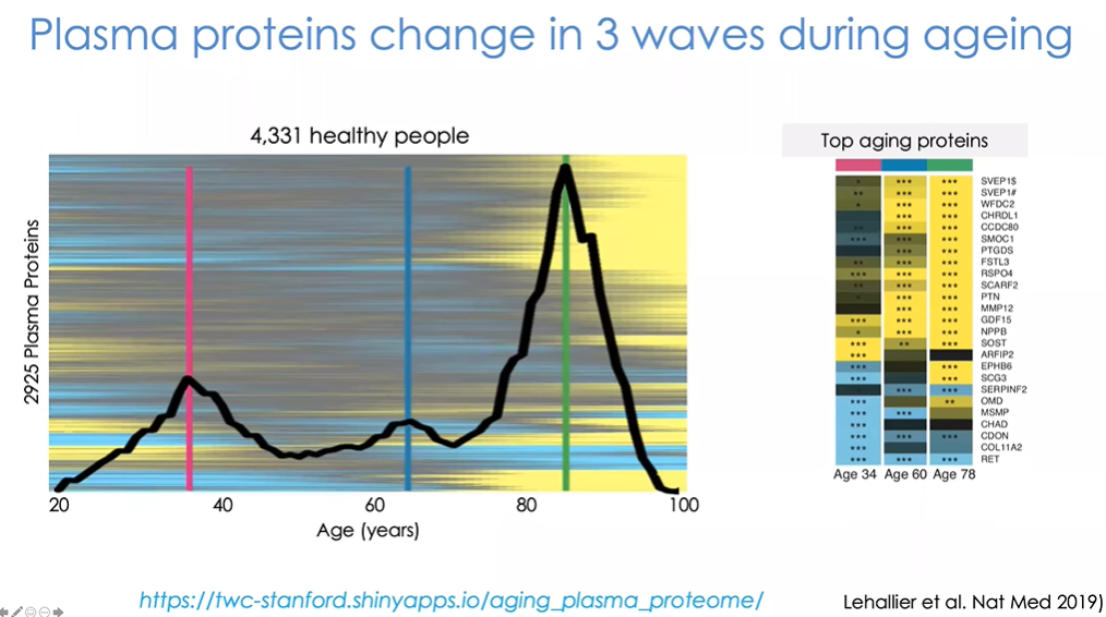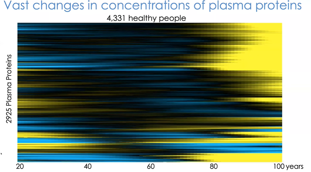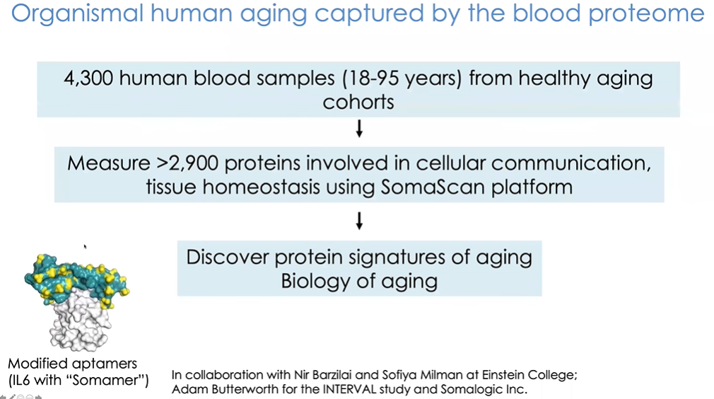 这里展示一个研究案例(图25)。该研究中我们通过INTERVAL项目以及与爱因斯坦医学院Nir Barzilai和Sofiya Milman的合作收集了4000多位受试者的血液样本,并借助SOMAscan平台对其中3000个蛋白质进行测定。SOMAscan利用经过特殊加工的核酸适配体(aptamers),能够对数千种蛋白的相对水平进行检测。