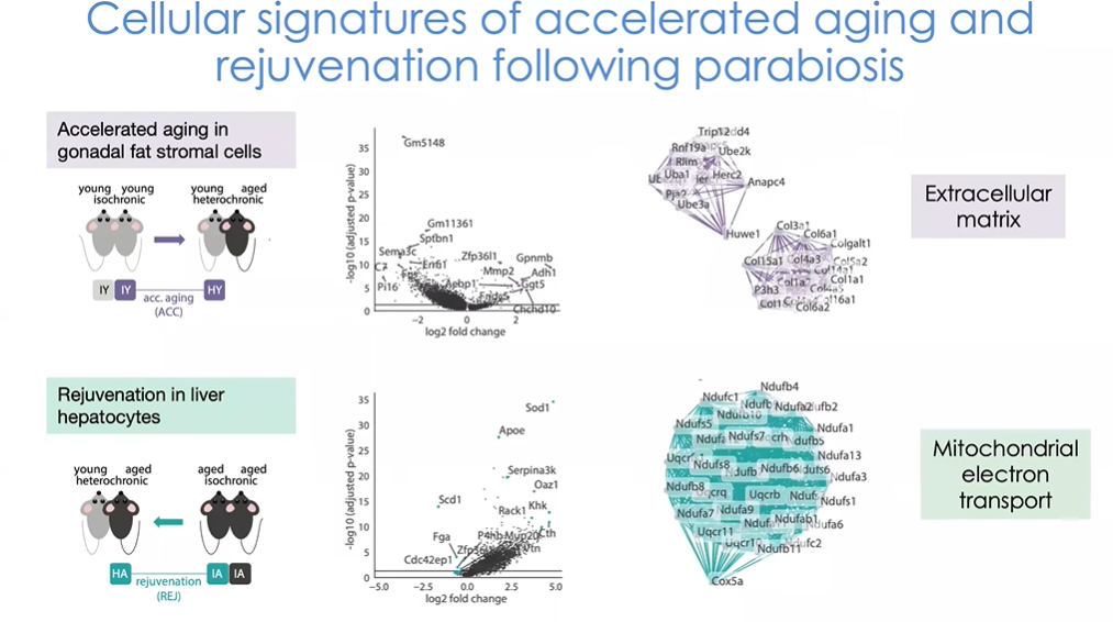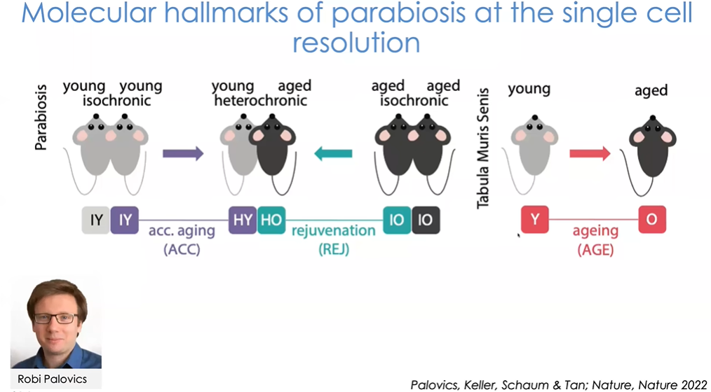在异体共生模型中,我们既有“异时共生”的年轻-年老小鼠对,也有“同时共生”对,即单独的年轻小鼠对和年老小鼠对;同时我们有Tabula Muris Senis数据库,其中包含正常小鼠整个生命周期所有主要组织和细胞类型的基因表达数据。我们的问题是:正常小鼠衰老过程与暴露在年老血液环境中的年轻小鼠衰老过程有何不同(图中我们将加速衰老标记为紫色)?暴露在年轻血液环境中的年老小鼠体内哪些组织和细胞发生了变化?我们需要关注哪些基因与正常衰老显示出相同的轨迹,即加速衰老;哪些表现出相反的趋势,即我们所说的“返老还童”。当然,这只是研究衰老过程的其中一种方式。
