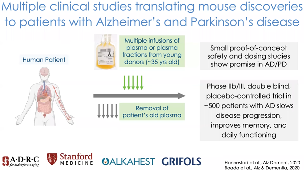 目前我们在Alkahest进行了一系列临床试验,我们收治轻度认知障碍或早期阿尔茨海默病患者,给他们注射来自年轻献血者的血浆成分。这些实验仅用于概念验证性的安全性与剂量研究,但已经在阿尔茨海默病和帕金森病的治疗中展现出前景。