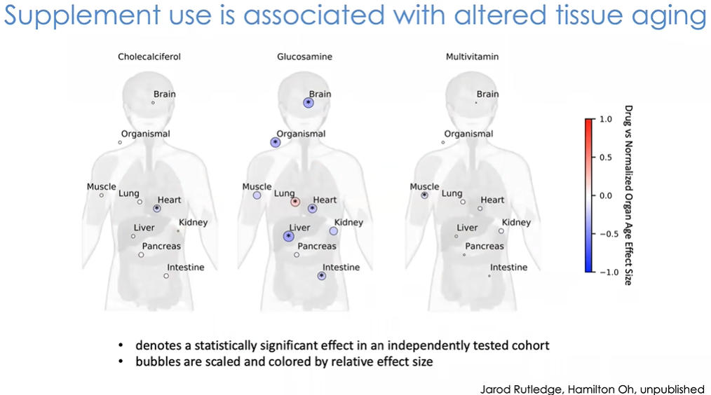 另一个让人兴奋的发现是,使用特定补剂对于延缓衰老具有积极作用(图36)。例如研究中服用维生素D的受试者,其心脏年龄显著较小。服用氨基葡萄糖(glucosamine)补剂的受试者,其体内多种组织都相对未服用者更加年轻。接下来我们希望进一步优化现有结果,通过实际干预手段获得更多信息。人的年龄如何发生变化?各组织时钟的生物通路是什么?其生物学意义是什么?希望在未来,我们能够招募到组织状态符合特定临床干预手段的受试者,具体来说就是根据其组织状态判断特定疾病的患病风险,在患病前实施干预。例如现在已知的,大脑加速老化的人群有患阿尔茨海默病的风险,肾脏加速老化的人群可能患高血压,心脏加速老化的人群可能患心脏病等。