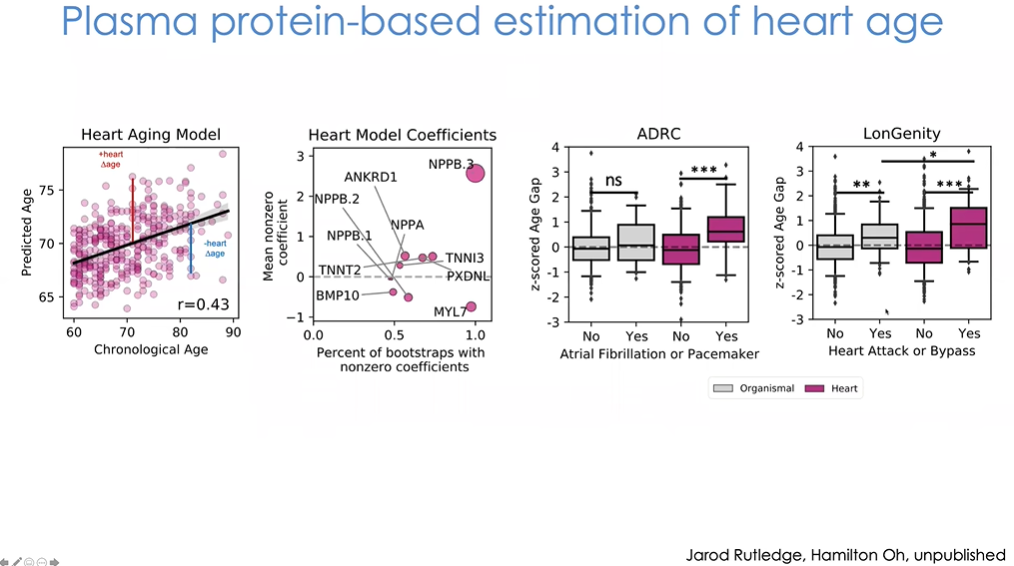 我们为每个器官都建立了时钟,这里仅展示个别例子。对于其中一部分受试者,我们建立了心脏时钟(图32),只要知道个体的实际年龄,就能够计算出其心脏年龄,这一过程中我们知道时钟包含了哪些蛋白质。有趣的是,该算法采用了两种临床常用的生物标志物:b型钠尿肽和肌钙蛋白,这是临床中存在心脏问题的老年患者需要检测的两项指标。同时我们还采用了其他几种参与心脏功能与衰老的蛋白质。在ADRC中使用生物体时钟,我们观测不到使用起搏器或存在房颤的受试者间有何差异,因此生物体蛋白质组时钟在此没有发挥作用。而当我们使用仅包含8个蛋白质的心脏特异性时钟时,使用起搏器或存在房颤的受试者在ADRC和LonGenity队列中都表现出明显差异。实际上在LonGenity中,生物体时钟是有效的,但显然单独使用心脏特异性蛋白质会有更好的预测结果。