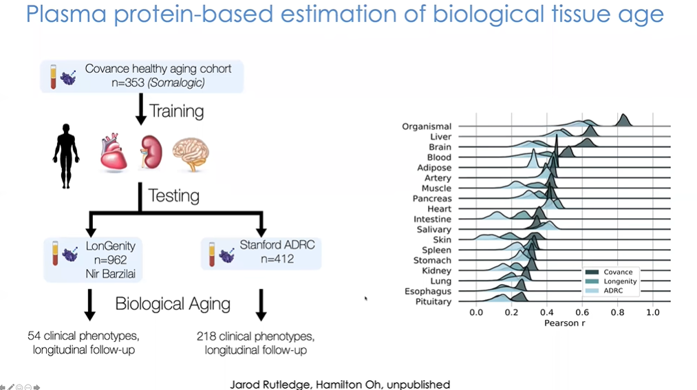 在该研究中,我们与SomaLogic公司合作构建了一个正常衰老验证队列,建立了心脏、肾脏、大脑时钟,并在全身范围内对时钟进行了训练(图31)。研究中没有限制算法使用的蛋白质。接着我们将其在独立数据集中进行测试。其中一个来自于Nir Barzilai的长寿研究和百岁老人研究,另一个是斯坦福对早期阿尔茨海默病、帕金森病以及痴呆患者的研究。