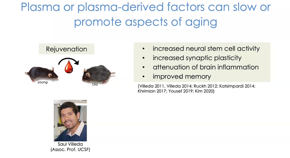 这位是加州大学旧金山分校副教授Saul Villeda(图8)。他所做的工作证实了我们确实能够从年轻小鼠身上采集血浆,并通过在几周内输入年老小鼠体内来实现类似效果。实验中他每3天或3周向小鼠注射总血量5%的血浆,结果显示小鼠大脑中的干细胞活性增强,与学习和记忆相关的突触可塑性增加,此外大脑炎症也得到了减轻。这或许解释了年轻血液环境影响衰老的关键机制。最重要的是,在功能层面上年老小鼠的记忆力得到了改善。