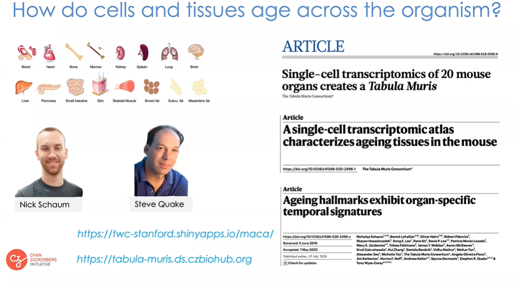 随后我们在斯坦福招募了十几个实验室,总人数至少有一百人。我们用了5周的时间处理小鼠,然后把组织分配给各实验室进行处理。我们对其进行了测序,得到了一些非常有价值的资源,比如Tabula Muris数据库,其中收集了小鼠主要组织及细胞类型的基因表达数据。同时我们记录了小鼠转录组随其年龄的变化情况。我们同时结合了Bulk测序和单细胞测序,Bulk测序提供统计功效,单细胞测序提供分辨率。