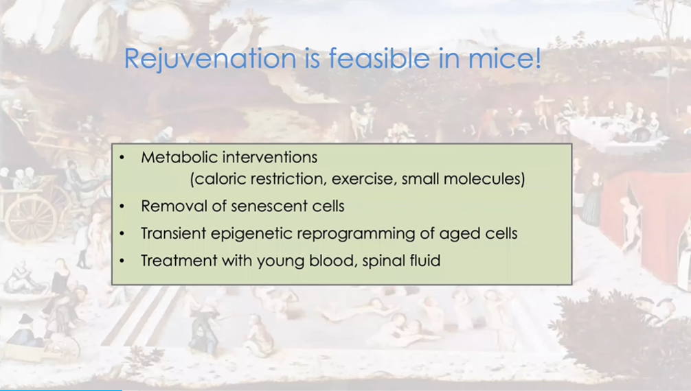 图5 研究者可以通过年龄相关干预措施对衰老动物进行治疗,以减缓其衰老过程、延长寿命,甚至在分子功能或细胞水平上逆转衰老。