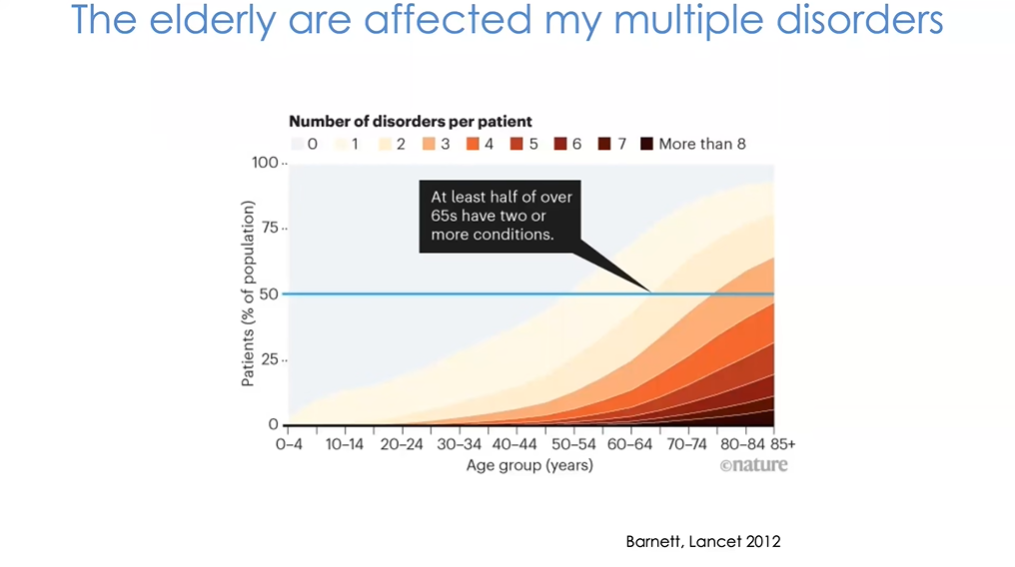 然而人体器官中不仅仅只有大脑会受到年龄的影响。研究表明,随着年龄的增长,人们所患的老年疾病也会越来越多。图3中的每种颜色代表了个体所患疾病的数量,研究显示65岁左右人群中约有一半人患有两种老年疾病;随着年龄的增长,患有多种老年疾病的人数也在持续增加。这一结果引发了领域内许多研究者对此类疾病——如心血管疾病、关节炎、癌症(许多癌症与年龄相关)、神经退行性疾病等——治疗思路的讨论:单独治疗某一种老年疾病是否有意义?是否能够针对衰老过程本身进行研究,从分子和细胞层面理解衰老机制?是否能够像人们常说的“返老还童”一样,减缓甚至逆转衰老过程,进而从根本上一次性解决老年疾病问题,而非逐个击破?(图4)