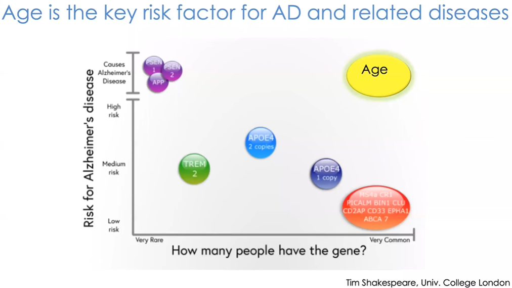 APOE基因就与阿尔茨海默病之间存在关联性,个体如果具有2个数量的APOE,其65岁时患病的风险将增加约12倍。然而,就阿尔茨海默病而言,真正容易被忽视的关键致病因素其实是年龄。无家族遗传史的散发性阿尔茨海默病患者占总患病人数的99.5%甚至更高,其最主要的风险因素显然是个体年龄的增长。因此,想要应对此类疾病,我们首先需要理解衰老问题。