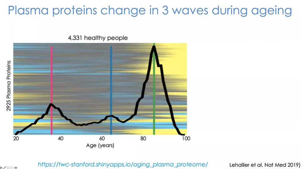 图27中我们标注出了所谓的“衰老波动(waves” of ageing)”。对比35岁以下和以上人群,约有400种蛋白质存在显著差异。随着年龄持续增长,蛋白质变化逐渐减少,直到65岁左右的出现另一个小高峰,到80岁左右呈现出最大变化。