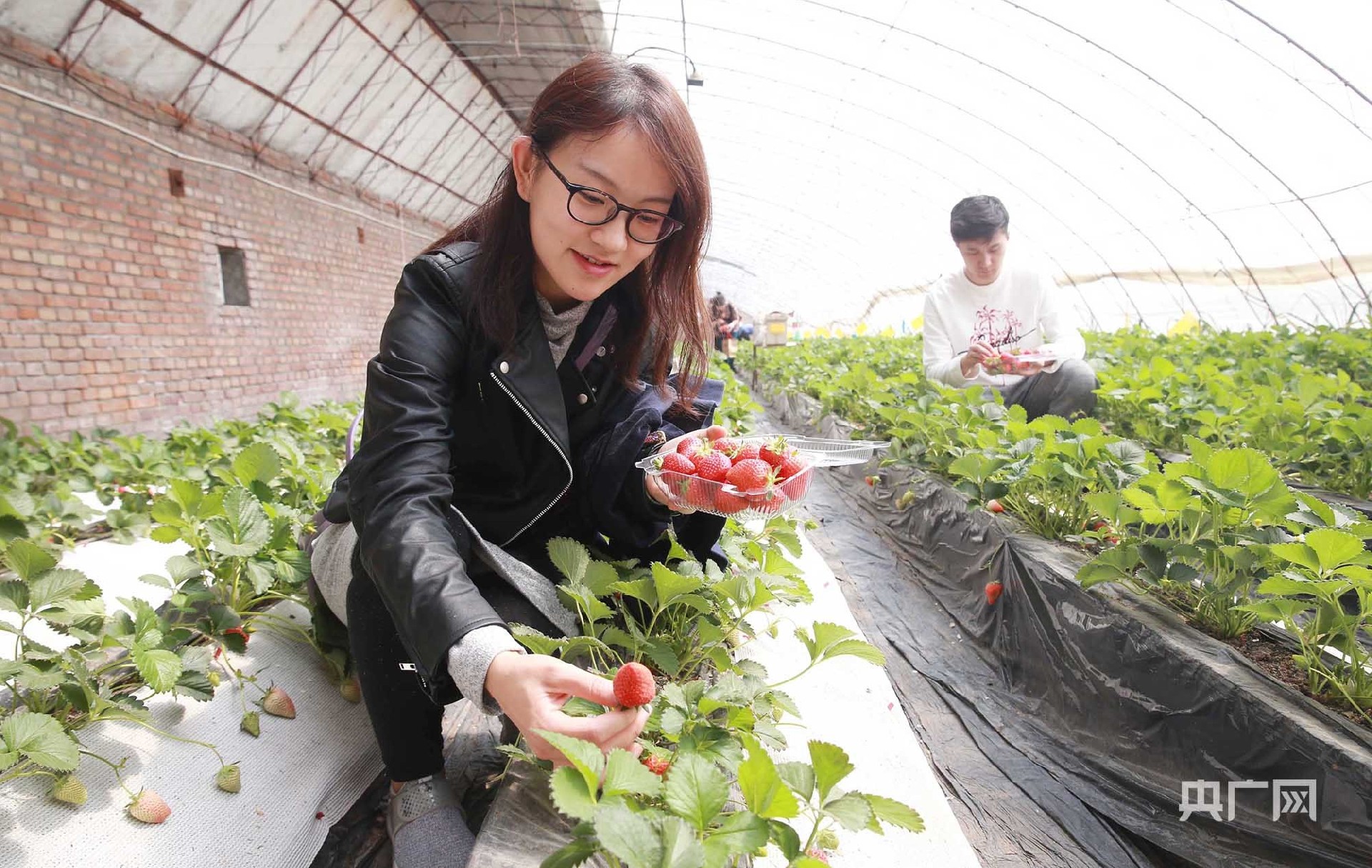 游客正在采摘草莓(央广网发 陈晓根 摄)