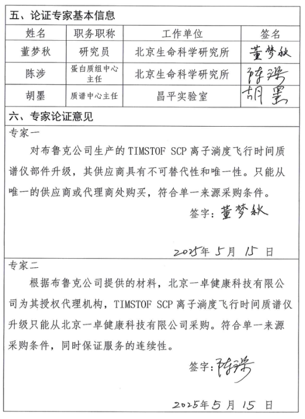采用单一来源采购方式的原因及说明:北京脑科学与类脑研究所于2022年购入了1台布鲁克公司生产的TIMSTOF SCP离子淌度飞行时间质谱仪,用于开展单细胞蛋白质组学和空间蛋白质组学等微量样品的蛋白质组学技术服务。近期,我所科研项目对单细胞蛋白质组学和空间蛋白质组学分析的灵敏度和分析检测通量有了更高要求,现有质谱仪的性能难以满足现阶段以及未来研究的需要。布鲁克公司于2025年初推出了专门针对该型号质谱仪的升级套件,对仪器的离子源、离子淌度池和数模转换器等核心部件进行了升级,该升级套件无法从其他供应商处获得;且升级过程中涉及备件的安装、仪器调试、软硬件匹配,以及维修服务也需要制造商布鲁克公司支持才能实现。根据《中华人民共和国政府采购法》第三十一条第(一)款“只能从唯一供应商处采购”的规定,北京一卓健康科技有限公司是布鲁克公司在北京地区唯一授权代理商,因此拟采用单一来源采购方式从北京一卓健康科技有限公司采购一套布鲁克公司的 TIMSTOF SCP 质谱仪的升级套件。