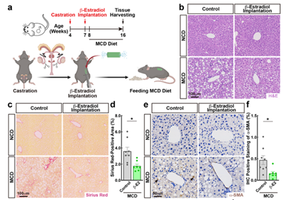 在外周组织层面,杨竞教授的研究进一步揭示了性激素调控非免疫细胞参与免疫反应的机制。以肝纤维化为例,绝经前女性发病率和病变程度通常低于男性,而绝经后则迅速加重。杨竞教授团队使用蛋氨酸-胆碱缺乏的特殊饮食(Methionine-Choline Deficient diet, MCD)构建小鼠肝纤维化模型,并在雌鼠及雄鼠模型中分别使用性腺切除术及性激素补充方案以探究肝纤维化性别二态性的性激素调控功能。研究发现,雌鼠中卵巢切除后明显加重肝纤维化病变,而雄鼠中睾丸切除术后外源性补充雌激素可明显缓解肝纤维化进程。
