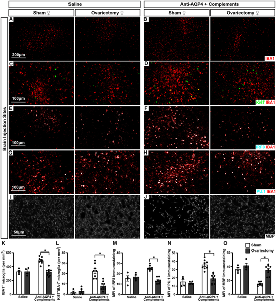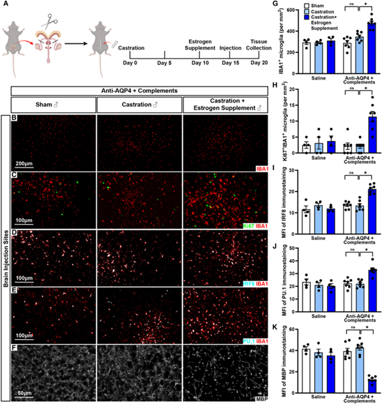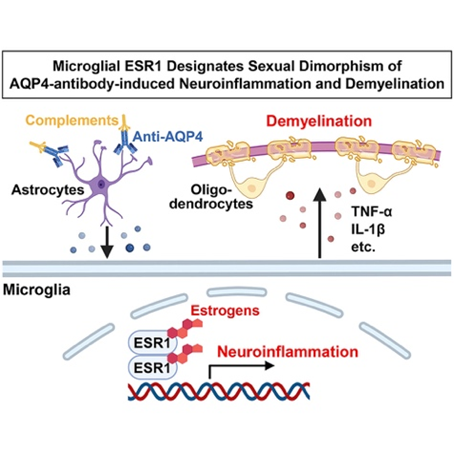 NMOSD是一种具有明显女性发病倾向的疾病。利用星形胶质细胞水通道蛋白-4(AQP4)抗体构建的NMOSD模型显示,与雄鼠相比,雌鼠表现出更严重的神经免疫反应和脱髓鞘损伤,具体表现为小胶质细胞中神经免疫应答相关转录因子PU.1(又称SPI1)和IRF8表达上调,以及成熟髓鞘少突胶质细胞数量减少。对雌鼠进行卵巢切除、对雄鼠进行去势手术并外源性补充雌激素后,NMOSD模型的性别二态性特征被显著逆转。由此表明,AQP4抗体介导的NMOSD模型中的女性易感性与高水平的雌激素密切相关。