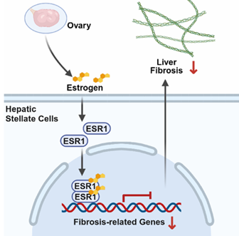 进一步研究发现人类与小鼠肝星状细胞(Hepatic Stellate Cells, HSC)中特异性表达Esr1,介导调控雌激素相关肝纤维化的性别二态性。雌激素通过ESR1直接抑制HSC中纤维化相关基因的表达,从而抑制肝纤维化进展。这一发现揭示了雌激素在外周组织器官中作为抑制因子的角色,与其在中枢神经系统中的促炎作用形成鲜明对比。
