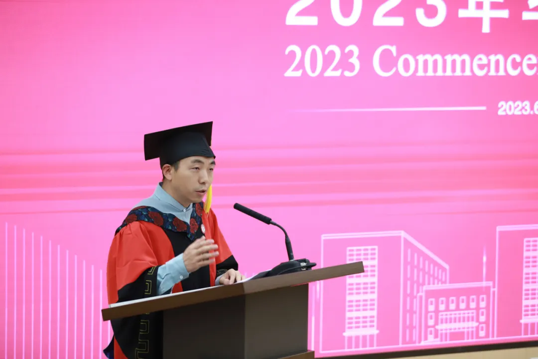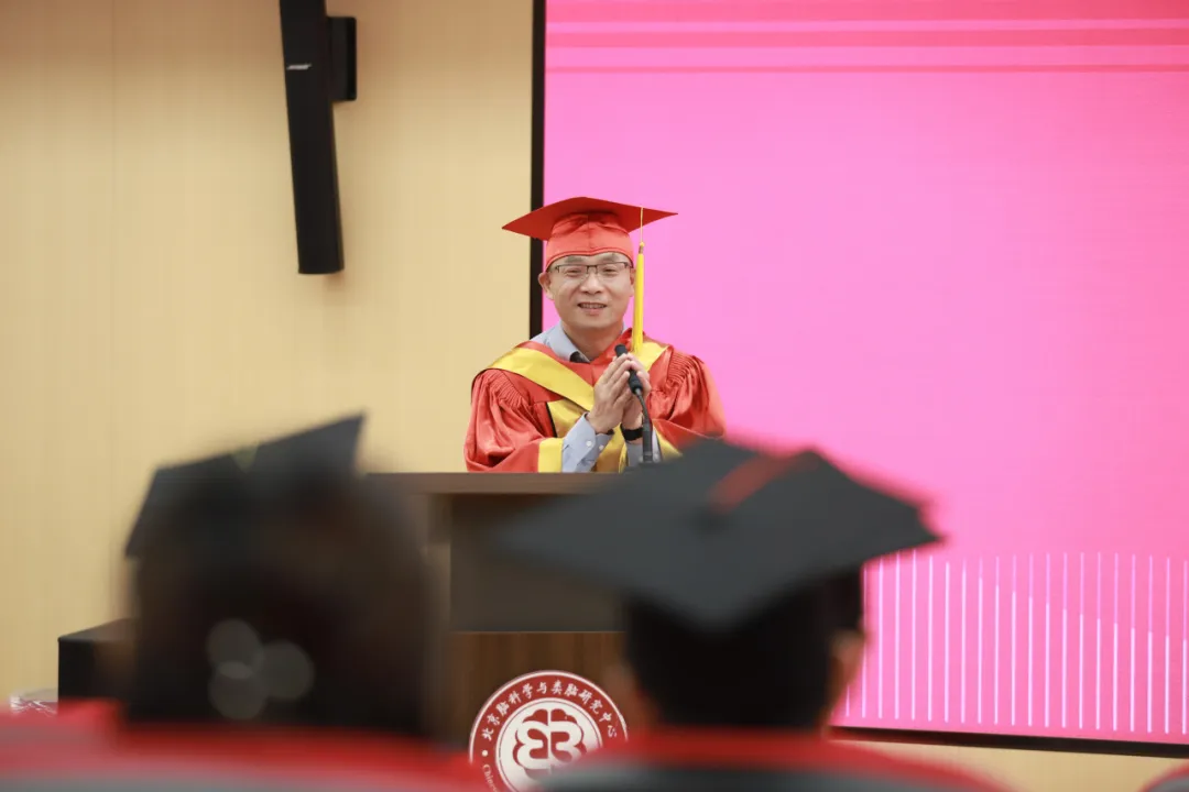 主持人马继延老师宣读毕业生名单后,研究员戈鹉平老师作为导师代表进行了发言。戈老师回顾了五年来CIBR博士生培养制度从无到有的历程,并动情地表示:“我在2013年就具备了招收博士生的资格,但回国以后才开始招收研究生。特别感谢我们实验室的张亭亭博士,让我在10年后的今天真正成为了博士生导师。”他鼓励几位毕业生,在今后的职业道路上追寻自己梦之所想,心之所向。