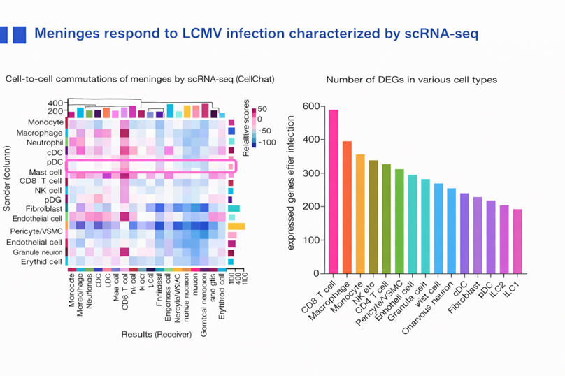 报告最后转向中枢边界结构,重点介绍了脑膜在免疫监视中的作用。曾教授指出,脑膜并非传统意义上单纯起机械保护作用的被膜结构,而是一个包含丰富免疫细胞和基质成分的活跃界面组织。在这一组织中,免疫细胞能够监测来自循环系统和中枢微环境的信号,并在感染、炎症或损伤状态下作出快速反应。在脑膜免疫细胞中,曾教授团队重点研究了肥大细胞。团队开发了新型遗传工具——Tpsb2-CreERT2小鼠,特异性标记脑膜中的结缔组织型肥大细胞,发现其数量远超既往认知,是脑膜中仅次于巨噬细胞的第二大免疫细胞群。在感染模型方面,团队利用淋巴细胞性脉络丛脑膜炎病毒(lymphocytic choriomeningitis virus, LCMV)感染模型研究脑膜免疫变化,感染后脑膜的细胞组成、转录状态及细胞间通讯关系均发生明显重塑,其中肥大细胞表现出较为突出的应答特征,在感染过程中上调了多种与干扰素反应、抗原呈递及感染应答相关的分子程序。在机制层面,曾教授重点介绍了脑膜中一个关键的信号通路,即白细胞介素-33–ST2信号轴(interleukin-33–ST2 signaling axis):肥大细胞高表达ST2(interleukin 1 receptor-like 1, IL1RL1),而白细胞介素-33(interleukin-33, IL-33)则主要来源于脑膜中的Prrx1阳性基质细胞(Prrx1-positive stromal cells)。感染发生后,脑膜局部IL-33水平发生变化,提示基质细胞可能在脑膜免疫反应的早期阶段发挥信号发起作用。脑膜肥大细胞对于抗病毒细胞免疫的建立是必要的,感染后肥大细胞可通过转录重塑和脱颗粒反应促进CD8⁺ T细胞的募集及功能发挥,从而有助于病毒清除。相反,当肥大细胞被耗竭或其关键信号通路受损时,脑膜局部的抗病毒免疫能力下降。由此可见,脑膜作为脑与外周之间的重要边界,不仅是结构屏障,更是一个具备主动免疫调控能力的功能界面。