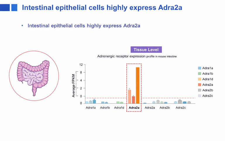 首先,曾教授介绍了其团队围绕肠内分泌L细胞(enteroendocrine L cells)与肠道交感神经之间功能联系所开展的研究。肠道不仅是营养吸收的重要器官,同时也是神经、内分泌与免疫信号整合的重要场所。其中,L细胞能够分泌胰高血糖素样肽-1(glucagon-like peptide-1, GLP-1)等肠促胰素,在葡萄糖耐量、胰岛素分泌及食欲调控中发挥重要作用。团队发现,Adra2a在肠道上皮细胞中高表达。利用基因敲除小鼠模型揭示了一条新颖的“肠-脑轴”通路:交感神经活动增强时,释放的去甲肾上腺素作用于肠道Adra2a受体,抑制肠道L细胞分泌GLP-1。GLP-1释放减少导致血糖升高,同时大脑葡萄糖摄取降低,进而损害认知功能。敲除Adra2a可解除该抑制,增加GLP-1释放,改善血糖水平和认知能力。这揭示了交感神经在应激状态下通过优先分配能量至外周器官(如心脏、肝脏),而非大脑,以应对即时需求的生理逻辑。