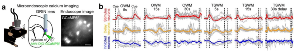 利用GRIN lens,课题组对习得工作记忆任务的Smim32-cre小鼠CLA神经元进行单细胞钙成像。结果显示CLA对cue的响应特征可分为三类:cue激活(stimulus),延迟激活(delayed),无响应(inhibited)。