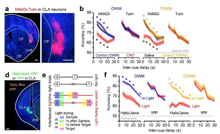 使用化学遗传学(hM4Di)或光遗传学工具(Halo/Jaws)在cue呈现期抑制CLA神经元,小鼠的感官能力不受到影响,而工作记忆任务的正确率显著下降,表明抑制屏状核神经元活性可引起工作记忆障碍。综合以上发现,Dr. Carleton将屏状核类比为大脑的随机存储单元(RAM):信息经大脑皮质加工整合后,暂时存储于屏状核等待调用;一段时间后,过期的信息被自动清除。