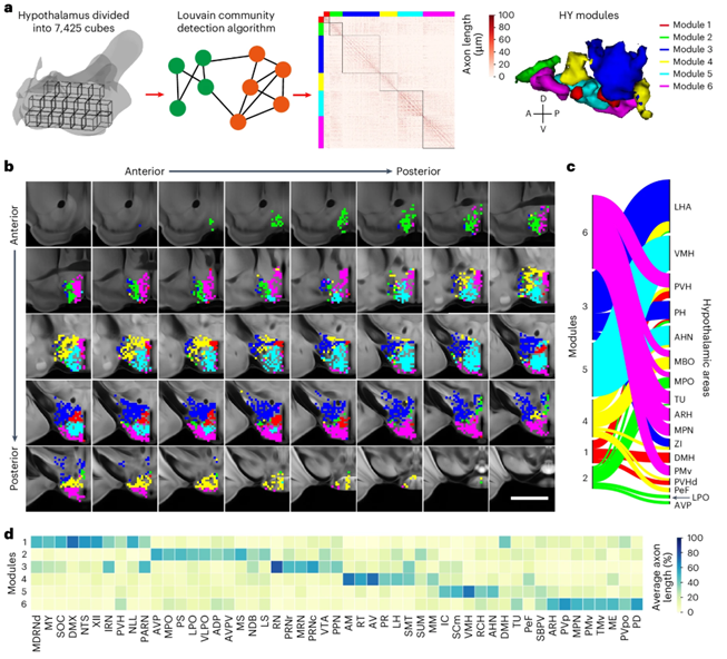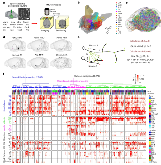在脑所的学术报告中,许晓鸿博士首先从下丘脑这一本能行为的整合调控中心切入,为大家介绍了关于下丘脑肽能神经元单细胞连接组的研究工作。过去许多研究已经证实,下丘脑作为整合中枢,在生物接收外界刺激信号,在不同内在情绪状态下对其产生不同行为反应的调控中扮演了关键作用。许晓鸿课题组及其合作者们通过对7000余个单细胞连接组的分析发现,有别于以往广泛认为的“One to One”的投射方式,下丘脑的单个肽能神经元可能投射到多个下游脑区,并形成许多参与不同行为调控的“module”,像相互联系的“朋友圈”一样,对多种本能行为(如进食、社交、睡眠等)进行分工协同调控。